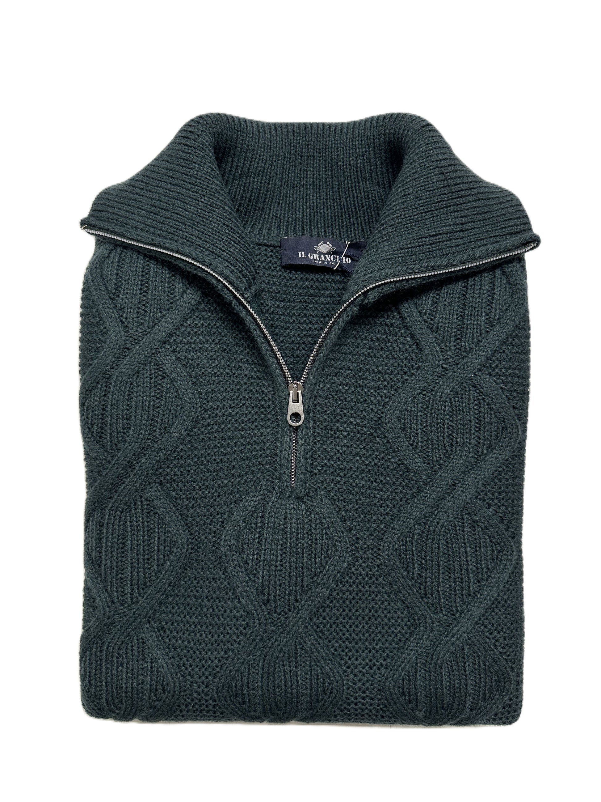 Maglia a mezza zip Il Granchio tinta unita lavorazione coste e rombi tono su tono capo giovanile con vestibilità regolare, particolarmente adatto per le fredde giornate invernali e per tutte le occasioni. Composizione 60% Lana 40% Acrilico