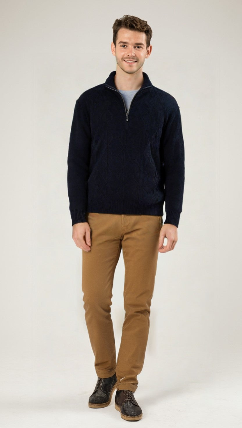 Maglia a mezza zip Il Granchio tinta unita lavorazione coste e rombi tono su tono capo giovanile con vestibilità regolare, particolarmente adatto per le fredde giornate invernali e per tutte le occasioni. Composizione 60% Lana 40% Acrilico